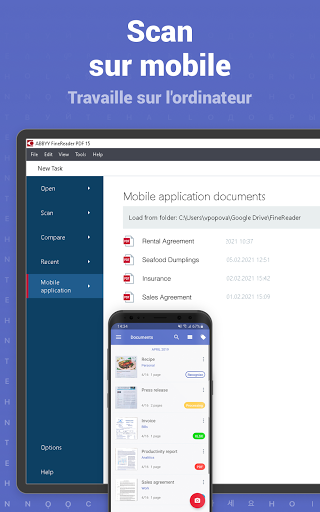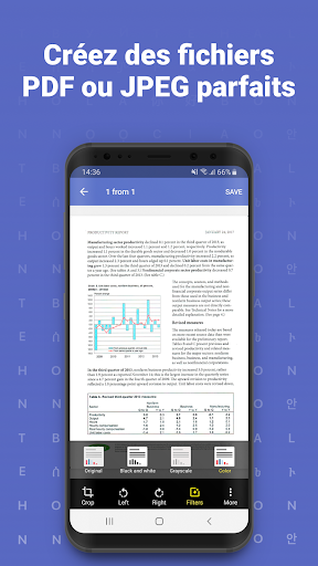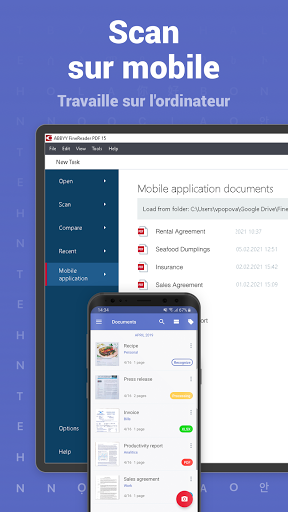 Utilisez FineReader PDF sur votre smartphone ou votre tablette Android pour numériser des document papiers, contrats, reçus, articles de magazine, notes, recettes, images, graphiques, tableaux, livres, tableaux blancs ou même des panneaux d'affichage dans la rue et ainsi obtenir des copies numériques parfaites. Idéal pour une utilisation individuelle, professionnelle, gouvernementale ou scolaire - n'importe quand, n'importe où. FineReader est un formidable outil de numérisation, toujours à portée de main.