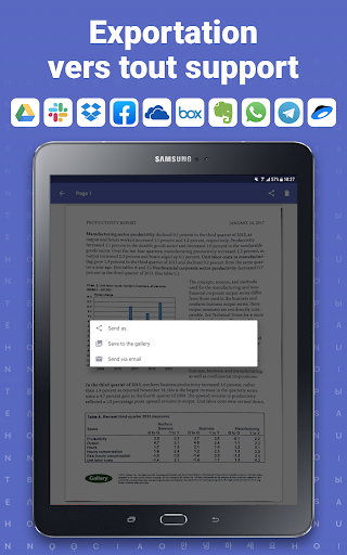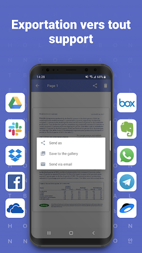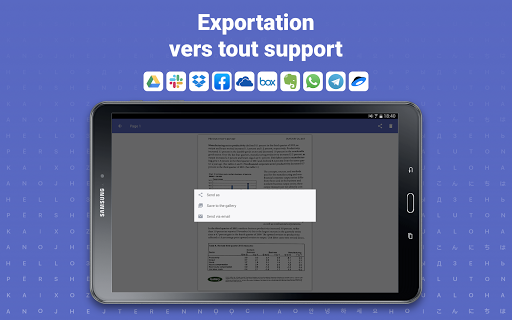 • Partagez et exportez les résultats n'importe où envoyez par email, vers FineReader PDF pour Windows, réseaux sociaux ou enregistrez dans vos stockages sur le cloud préférés - Google Drive, Box, Evernote, Dropbox, Yandex.Disk et plus encore.