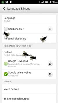 User can add or remove fly. Flies have got behavior like real flies. Just open flies in phone application and click on add fly to add flies in phone. To close flies on screen application click on remove flies button and remove all flies you added in phone.