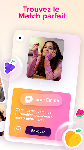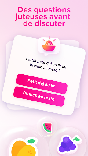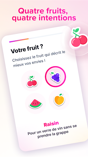 Chaque personne recherche des choses différentes sur une appli de rencontre : une relation sérieuse, un verre de vin en terrasse ou plus. Choisissez votre fruit en fonction de vos intentions, puis découvrez votre partenaire dans l’espace de tchat gratuit ! 🍒🍇🍉🍑