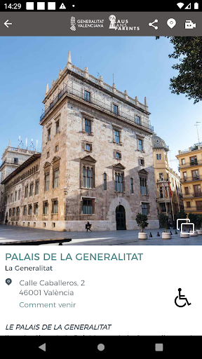- Connaître l'horaire, les jours de visite et l'accessibilité dans la modalité de visite autonome (non guidée). Pour ce type de visite, il y a, le disponible dans l'app une information individualisée sur chaque palais et sur un lien aux webs distincts de l'institution ou d'institutions qui héberge chaque édifice.