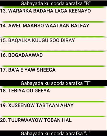 Gabayadu waxay isugu xig-xigaan XARAF-RAACA gabayada, alif-beeto af-somali ahaana.