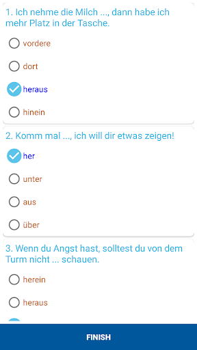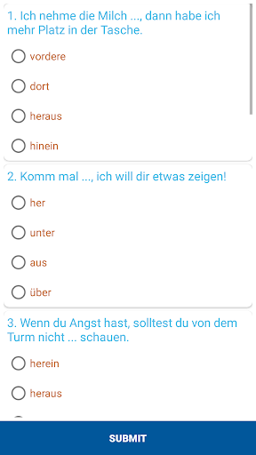 avec cette application, vous trouverez des exercices sélectionnés pour le niveau B2 (avancé / intermédiaire 2).Ces exercices vous aideront à mieux comprendre et approfondir le vocabulaire avancé et la grammaire de ce niveau.Pour former votre vocabulaire, vous devriez également lire / écouter des nouvelles ou des livres allemands.