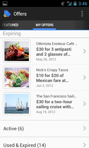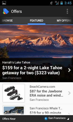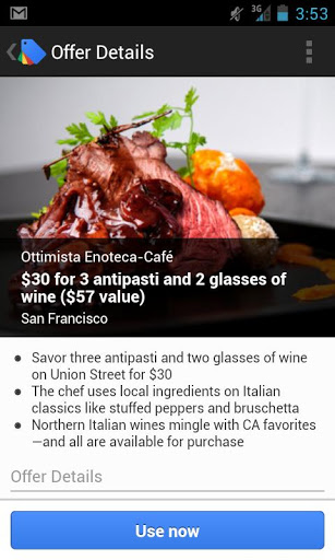 Discover, buy and redeem great deals with your Android phone.From food to fun, Google Offers connects you with great deals every day in your city.We have hundreds of offers you can purchase in advance and thousands of free offers that you can use instantly or save for later. Either way, when you are ready to use your offer, simply open your Google Offers app at the business and show your offerGoogle Offers has partnered with dozens of deal sites and thousands of local businesses to bring you great offers across many categories. Our app notification will alert you of great featured offers so you dont miss a great chance to save money. Enjoy the convenience of browsing, buying and redeeming offers near you onthego. Easily redeem your offers without having to print your vouchers.Cities available US only: Atlanta, Austin, Baltimore, Boston, Brooklyn, Charlotte, Chicago, Columbus, Dallas, Denver, Detroit, Fort Worth, Houston, Indianapolis, Kansas City, Long Beach, Los Angeles, Miami, Milwaukee, Minneapolis, NYC, Philadelphia, Phoenix, Pittsburgh, Portland, Oakland East Bay, Oklahoma City, Omaha, Orlando, Sacramento, Salt Lake City, San Antonio, San Diego, San Francisco, San Jose, Seattle, St. Paul, St. Louis, Tampa and Washington D.C.