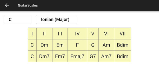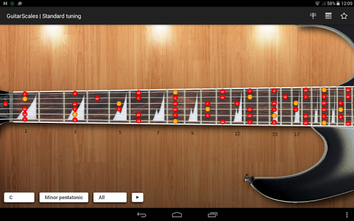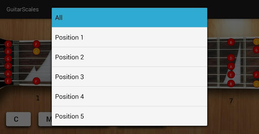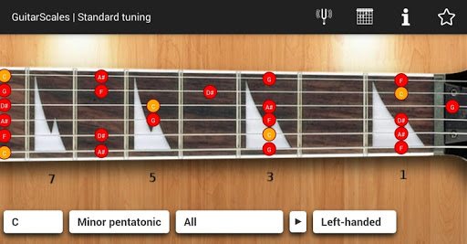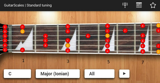 is a free android application for learning guitar scales and memorize the notes on the guitar fretboard. It contains chromatic, Ionian (major), harmonic major, Dorian, Phrygian, Lydian, Mixolydian, Aeolian (minor), Locrian, harmonic minor, major pentatonic, minor pentatonic, blues pentatonic, Hungarian Gypsy, Ukrainian Dorian, Acoustic, Persian, Algerian, Flamenco, Hawaiian, Chinese, Byzantine and Neopolitan scales.