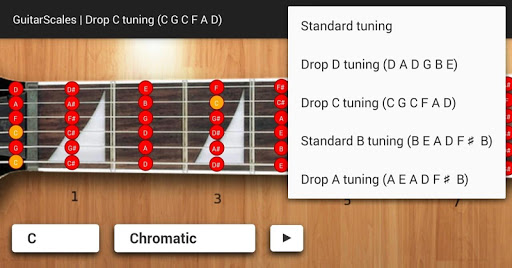 Guitar Scales app contains scales for standard, 1/2 step down, 1 step down, standard B, drop D, drop C and drop A tunings.