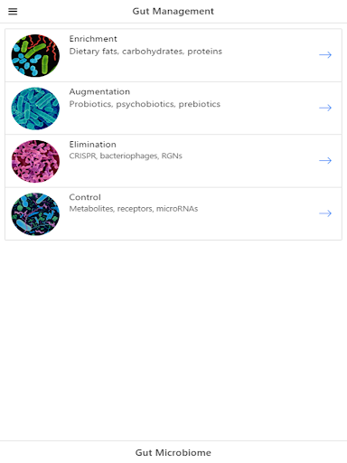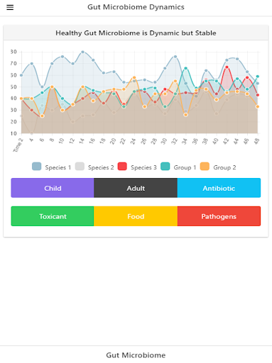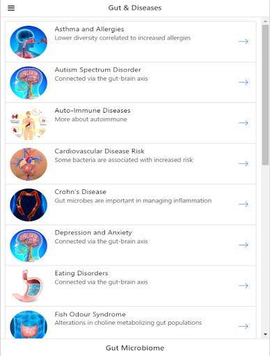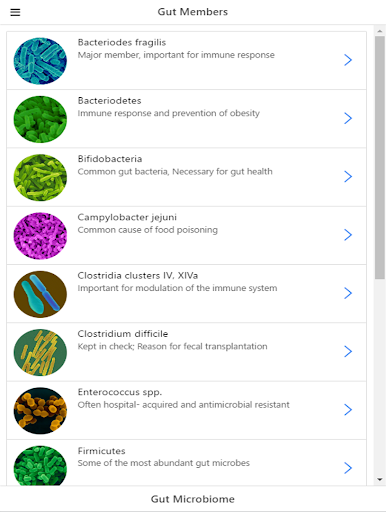 Did you know that the gut microbiome is associated with many diseases, including depression? The bacteria in the gut influence a number of systems in the body including the immune system and gut-brain axis. In this application, users can browse through information collected from scientific publications about the gut microbiome and its effect on the body and overall health. As new findings are emerging, it is important to stay connected research about commensal bacteria, pathogenic bacteria, community perturbations, and other topics.