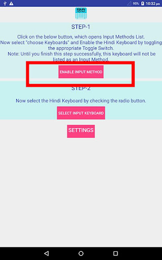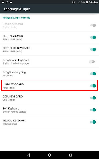 2. Go to "Settings"->"Language & input -> Current Keyboard -> Choose Keyboards & Enable Hindi Keyboard -> Check the "Hindi Keyboard".