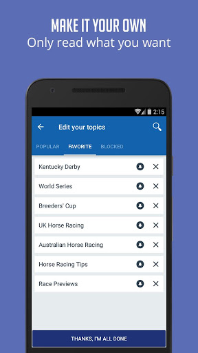 * Choose your favorite topics and/or block topics you don't want so you can easily stay on top of the things in the topics that matter to you. If there's a specific race, horse, jockey or anything else you'd like to follow, this is the easiest, most efficient way to do so!