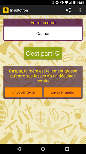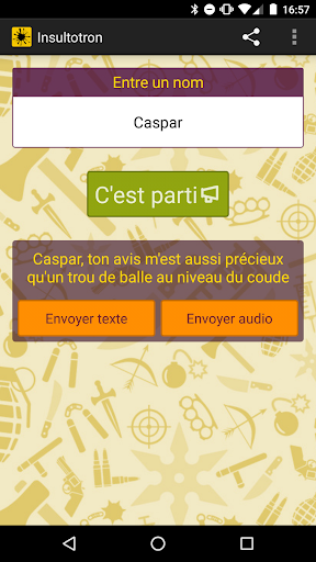 L'insultotron est le générateur d'insultes. Contrairement aux autres applis du genre, l'insultotron prononce les insultes et te permet de partager le message audio par exemple via Whatsapp ! - Insulter tes amis et tes ennemis n'a jamais été aussi simple. - Il te suffit d'entrer le nom de la personne que tu veux insulter et c'est parti !