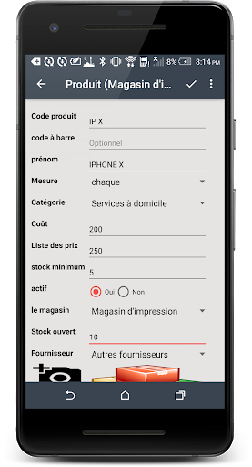 o Produits: Créer un produit intégré avec le programme de lecteur de code-barres pour utiliser le code-barres et vous pouvez également stocker l'image du produit.
