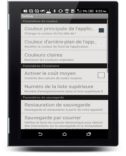 o Réglage: contrôle les fonctionnalités de l'application, telles que la sauvegarde des données, l'utilisation d'un mot de passe, etc.