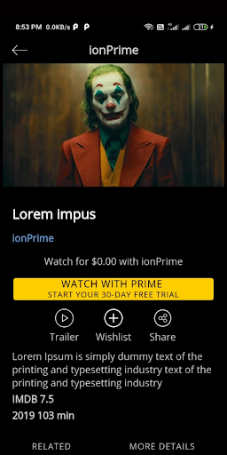 Modèle d'application vidéo ionic 4 Prime, connectez-vous, enregistrez-vous, réinitialisez le mot de passe, l'écran d'accueil, la recherche, la liste de souhaits, le téléchargement, les paramètres, les détails, le profil de l'acteur et plusieurs autres.