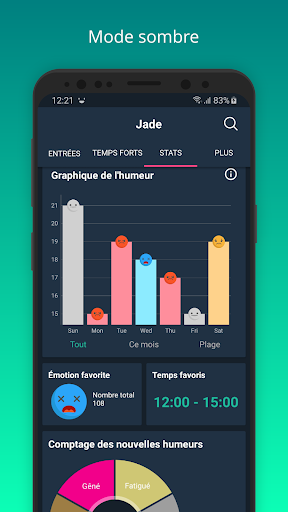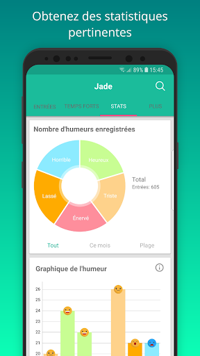 Définissez votre humeur, ajoutez un lieu et vos pensées si vous le souhaitez. Vous pouvez aussi écrire des notes et les sauvegarder dans Jade. Jade analysera ensuite toutes vos entrées et vous donnera des statistiques détaillées afin que vous sachiez comment va votre journée. Suivez vos humeurs, vos pensées et vos idées pendant la journée et utilisez les afin d’améliorer votre vie et de devenir plus productif.