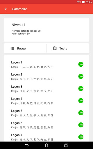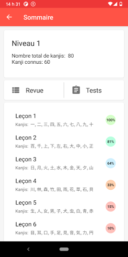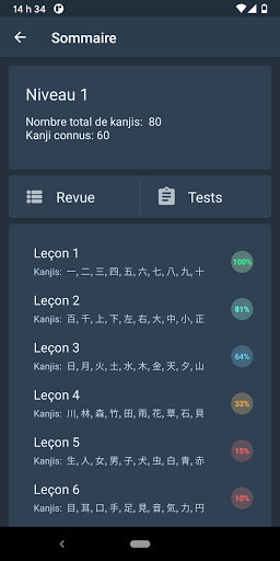 Pour rendre l'apprentissage de kanjis plus confortable, la liste de caractères est divisée en six niveaux selon les années scolaires japonaises. Chaque niveau contient des leçons qui incluent généralement 10 caractères et se composent de 3 parties: liste de caractères, exercices et révision.