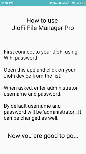 Votre téléphone doit être connecté au périphérique Jiofi via WiFi Inorder pour fonctionner correctement cette application.