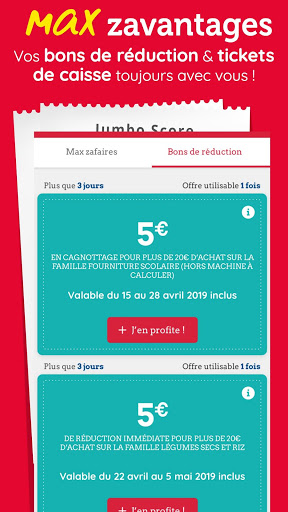 Avec la nouvelle appli Jumbo Score Max, fini les bons de réduction papier qui dépassent dans votre portefeuille. Fini les tickets de caisse perdus ! Faites le ménage dans votre portefeuille et profitez de tous vos avantages fidélité à portée de main !