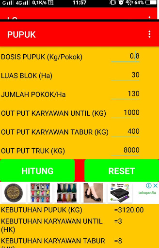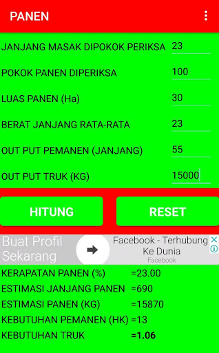 Setiap menu memiliki fungsi perhitungan kalkulator untuk menghitung beberapa perhitungan yang sering diperlukan oleh planter di pekerjaan land clearing, pemupukan, panen dan semprot.