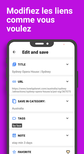 - Toutes les fonctions dont vous avez besoin pour modifier un signet : titre, balise, note, déplacer