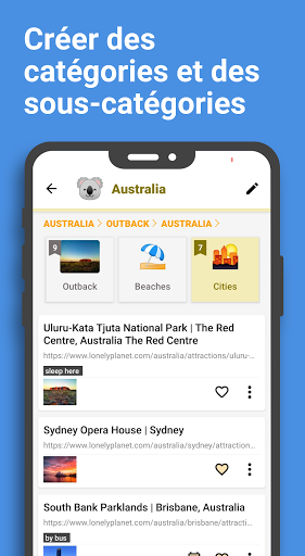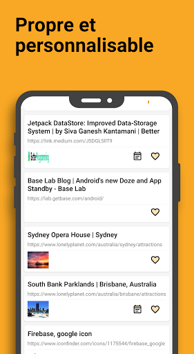 Sauvegardez vos signets de n'importe où, facilement et rapidement. Sauvegardez tout ce que vous découvrez : livres, articles, shopping, actualités, recettes... Gérez-les tous dans une seule application et visualisez-les plus tard grâce à un affichage hautement personnalisable.