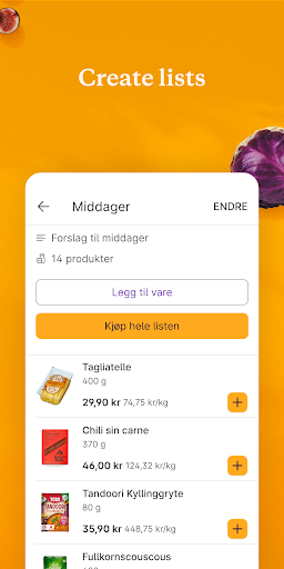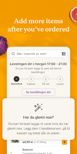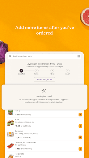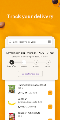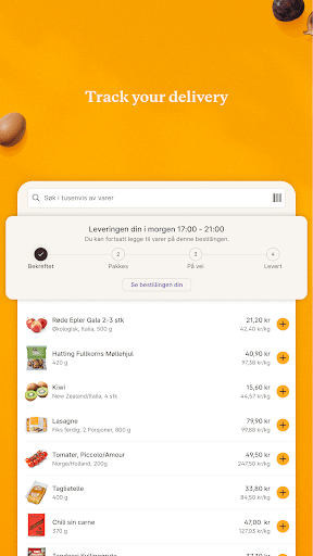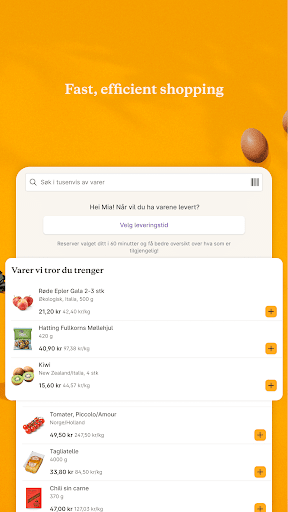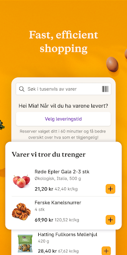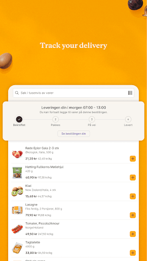 Choisissez parmi plus de 7 000 produits différents, faites vos propres récipients et achetez des ingrédients pour les recettes en un seul clic. Ensuite, tout est livré à votre porte avec un sourire. Juste comme ça. Ou, comme nous le disons en Norvège: Sånn!