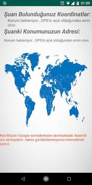 Uygulama bulunduğunuz yerin koordinatını ve adresini size gösterir. Adres bilgisi Google servislerinden alınmaktadır bundan dolayı adres gösterimi için internetinizin açık olması gerekmektedir. Uygulama hiçbir şekilde bulunduğunuz yerin koordinatını ve adresine kaydetmez. Yalnızca ekranda size gösterir. Adres ve koordinat bilgisi Google servislerinden alındığından dolayı doğru olmayabilir.