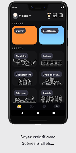 - Effets : jouez avec des effets lumineux tel que, visualiseur de musique, flamme, mouvement, clignotement, stroboscope, cycle de couleurs... et plus encore, tous réunis au même endroit.