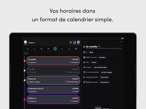 - Horaires : automatisez vos lumières pour s'éteindre progressivement, changer de couleur ou encore s'allumer et s'éteindre grâce à l'interface calendrier facile à utiliser.