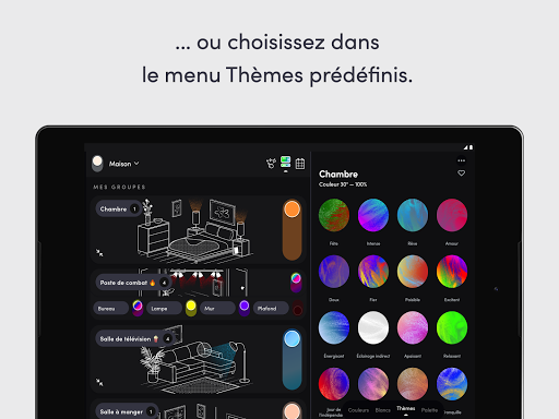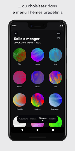 - Thèmes : une bibliothèque de combinaisons de couleurs accessible en un clic, de "Majestueux" à "Apaisant".