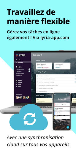 Avec Lyria, vous pouvez travailler complètement à distance. Que vous soyez au bureau, en télétravail, avec votre ordinateur portable sur votre canapé ou à la plage - avec Lyria, vous êtes complètement libre. Vous avez accès à tous vos projets et tâches à tout moment et de n'importe où. Pour une vue d'ensemble sur un ordinateur ou un ordinateur portable, notre portail Web confortable www.lyria-app.com est disponible.
