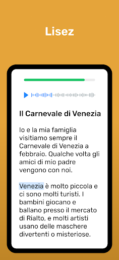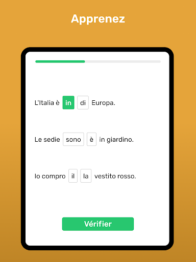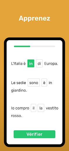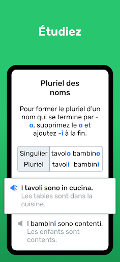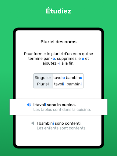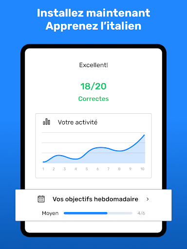 Un système d’apprentissage créé pour vous, à la fois simple et guidé : Vous aurez la sensation de progresser en italien, de plus en plus au fil des jours. Chaque phrase, exercice, révision et lecture ont été soigneusement sélectionnés pour vous.