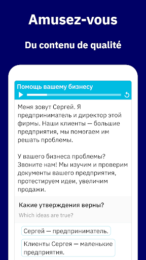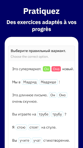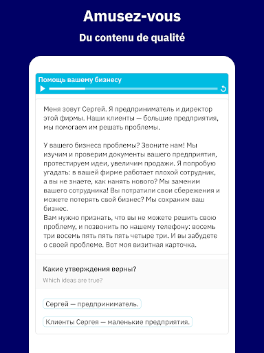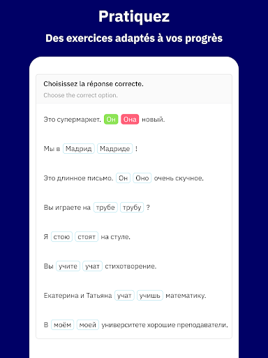 💡 Un système d’apprentissage créé pour vous, à la fois simple et guidé: Vous aurez la sensation de progresser en russe, de plus en plus au fil des jours. Chaque phrase, exercice, révision et lecture ont été soigneusement sélectionnés pour vous.