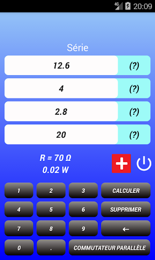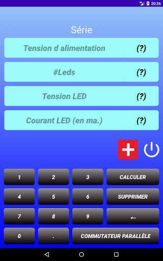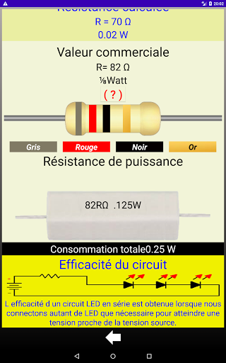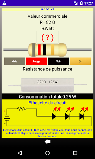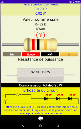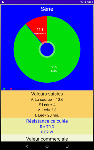 Nous avons ajouté un camembert montrant l'efficacité du circuit, la zone rouge indique la consommation d'énergie dans la résistance, la zone verte montre l'énergie consommée dans la led. Calculez vraiment la résistance de vos leds en série ou en parallèle, entrez simplement dans les champs les valeurs de tension source, le nombre de leds, la tension led, le courant led, touchez calculer et vous pourrez voir le résultat immédiatement, Si vous souhaitez voir des informations supplémentaires, appuyez sur le bouton , vous verrez alors les détails du circuit, tels que le diagramme à secteurs, la résistance calculée, la valeur commerciale, les couleurs des bandes, la puissance requise et la consommation totale du circuit.