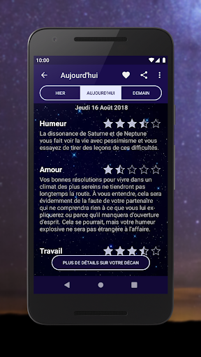 Ne vous contentez pas de 2 phrases pour décrire votre journée. Découvrez de nombreux détails sur différents aspects de votre astrologie zodiacale tels que le travail 💼, l'humeur 💆, la santé 💪, les relations amoureuses ou même vos numéros chance.