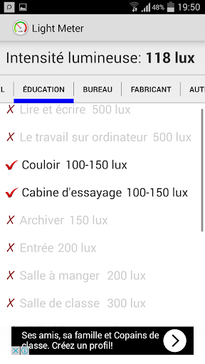 Light Meter est une application qui fournit recommandé plage d'intensité lumineuse pour différentes activités / environnements et vérifier si la lumière actuelle est approprié pour lequel les activités / environnements. Elle contribue à protéger votre vue!