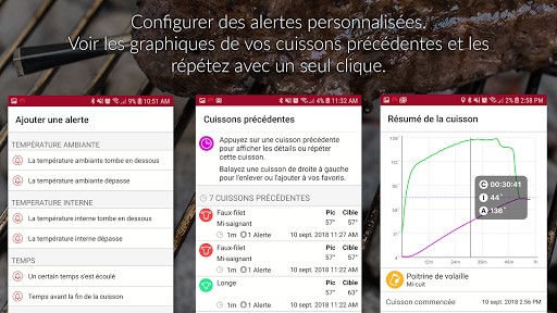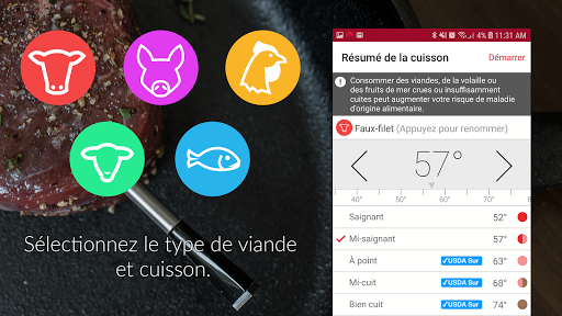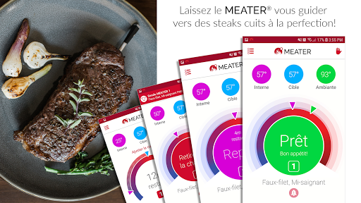 L'application MEATER, associée au thermomètre à viande MEATER (vendu séparément sur https://meater.com/shop), changera la façon dont vous préparez vos repas et en fera une expérience nouvelle et passionnante. En utilisant des algorithmes logiciels brevetés, l'application MEATER vous donnera des estimations de temps de cuisson, et vous guider vers le steak , le poulet, la dinde, le poisson ou toute autre coupe de viande que vous avez jamais cuisiné.