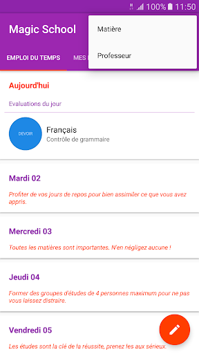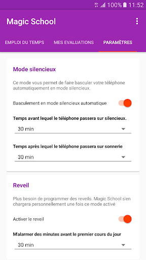 Magic School est une application dédié aux élèves et étudiants les permettant d’enregistrer tous les détails sur leur emploi du temps, leur professeur, leur matière; d’enregistrer leur évaluation ; de basculer leur téléphone en mode silencieux automatiquement durant les heures de cours et revenir en mode sonnerie après; et enfin de transformer leur téléphone en réveil.