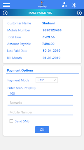 3) Make payments by Card or Cash/Cheque of a customer and print receipt via Bluetooth printer.