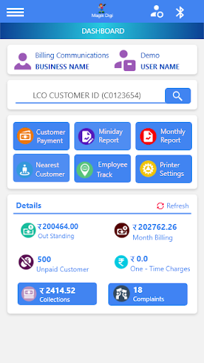 1. View Dashboard reports like counts of outstanding, month bill, Employee Collections, Overdue amount, Complaints and Deactivated Customers.