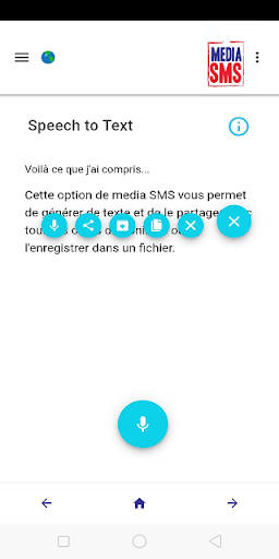 • Speech to Text, cette option vous permet de dicter votre texte dans la langue système choisi dans votre mobile le texte sera instantanément transcrit en texte par l'application, 5 choix disponible: