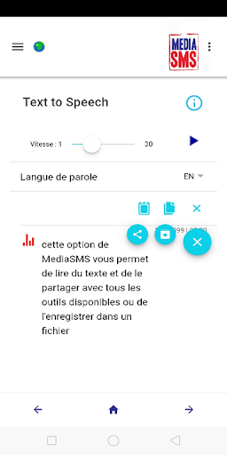 • Text to Speech, cette option vous permet de lire tous type de texte dans la langue de votre choix (actuellement Allemand, Anglais, Arabe, Espanol, Français, Italien ou Turc) avec un maximum de 3999 caractères a la fois (Equivalent document d'une page), vous pouvez partager le texte lu ou l’enregistré dans un fichier, vous pouvez aussi modifié la vitesse de lecture de votre texte.