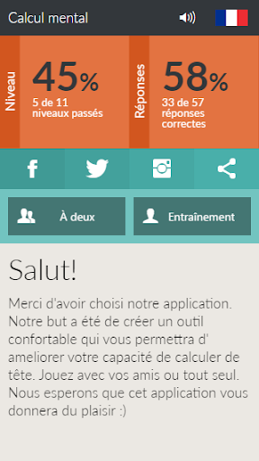 Merci d'avoir choisi notre application. Notre but a été de créer un outil confortable qui vous permettra d' ameliorer votre capacité de calculer de tête. Jouez avec vos amis ou tout seul. Nous esperons que cet application vous donnera du plaisir :)
