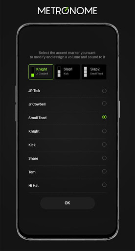 La fonctionnalité de comptage est également ajoutée pour vous aider à vous familiariser avec l'ensemble BPM. Appuyez sur pour sélectionner votre tempo et commencer à jouer. Le BPM sera compté automatiquement et votre BPM sera plus serré que jamais. En outre, vous pouvez sélectionner le marqueur d'accent que vous souhaitez modifier et attribuer un volume et son son. Il existe 3 options principales: Knight, Slap 1 et Slap 2 et de nombreuses options plus petites dans chacune. Appuyez sur l'icône de la note pour modifier le marqueur d'accent que vous souhaitez et le lire.