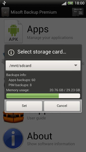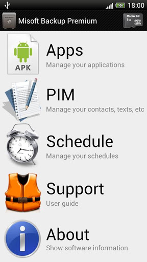 Misoft backup Free is the right way to backup and restore all the data you care of. contacts texts, settings and applications will be safe thanks to our software solution. Our revolutionary software also includes batchand schedule operations schedule only in premium version which will simplify your everyday life. A tap and you will have your backups always up to date, every day, automatically. We also support all android version up to jellybean and phones with multiple storage cards.Here are all the features: apps backup amp; restore root required over 20 batch operations backup amp; restore of personal informations multiple storage cards support scheduled operations only in Premium version user guide
