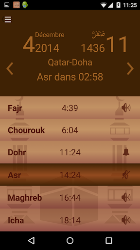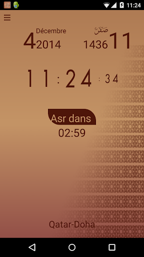 -Qibla vous donnera la direction de La Mecque (en fonction de l’emplacement configurée dans la rubrique Paramètres)