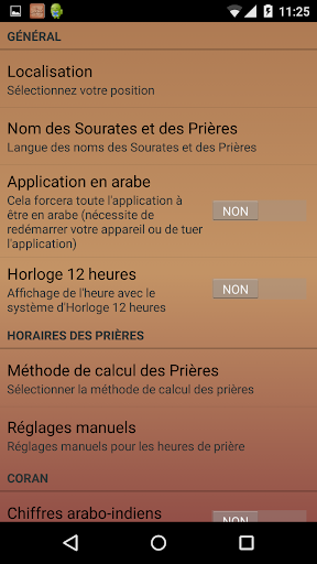 -Notifications pour les horaires de prières, vous pouvez configurer chaque prière avec un type de notification différent (avant tout vous devez choisir votre emplacement dans la rubrique Paramètres)