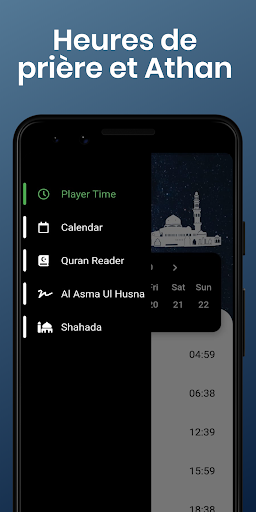 • Horaires de prière précis en fonction de votre emplacement avec plusieurs paramètres disponibles (angles)