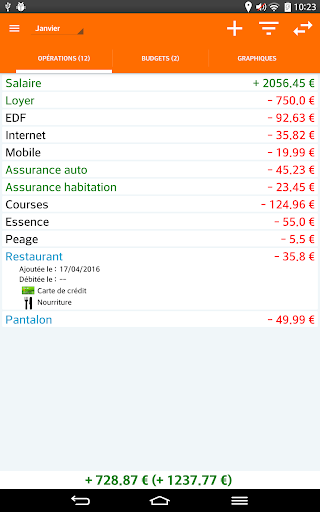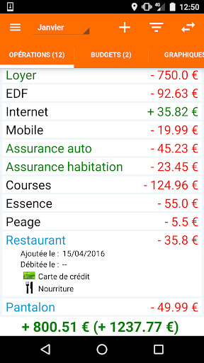 Cette application vous permet de saisir vos opérations courante et d'obtenir une vue globale sur votre budget du mois en cours (solde réel et virtuel). Vous pouvez également définir la méthode de paiement et la catégorie des opérations.