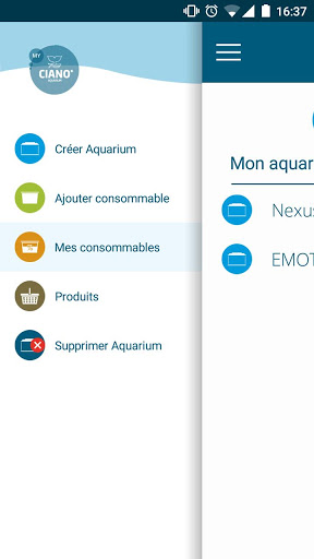 Le menu principal vous donne accès à vos aquariums et consommables, associés à chacun d’entre eux.