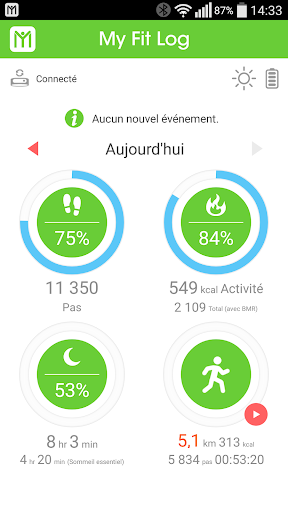 My Fit Log fonctionne idéalement avec Wristband/Smartwatch, qui suit/enregistre vos progrès lors des entraînements et votre qualité de sommeil dans la vie de tous les jours. Tandis que Wristband/Smartwatch vous permet de définir des objectifs différents pour vous motiver à essayer des entraînements plus intensifs, My Fit Log propose des rappels amicaux pour vous tenir informé des différents avis provenant directement de Wristband/Smartwatch, dont les appels entrants, les e-mails, les messages, les alertes des événements du calendrier ou les notifications push d'autres applications de réseaux sociaux. Pendant l'entraînement, vous pouvez visualiser les données en temps réel de vos progrès lors des exercices à partir de My Fit Log sur l'écran Wristband/Smartwatch, dont la fréquence cardiaque, la vitesse, la distance, les calories, etc. Outre le suivi des entraînements, My Fit Log vous permet également de créer des programmes d'entraînement personnalisés pour vous aider à vous exercer et atteindre différents niveaux d'objectifs de forme physique. L'exercice est toujours plus amusant quand vous en faites avec vos amis. Utilisez la fonction conviviale Fitness Pals pour inviter vos amis à vous rejoindre quand vous faites de l'exercice, où qu'il ou elle soit, et motivez-vous mutuellement avec des mots d'encouragement. De plus, My Fit Log vous permet de sauvegarder ou de restaurer facilement toutes les données d'entraînement avec Google Drive à tout moment, en seulement quelques clics.
